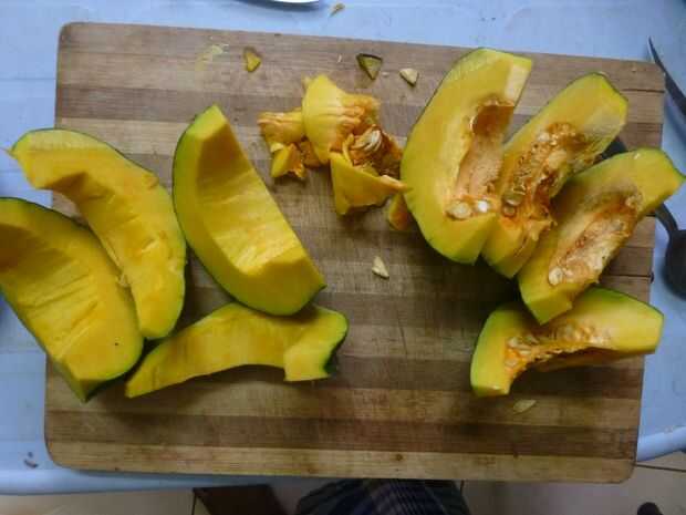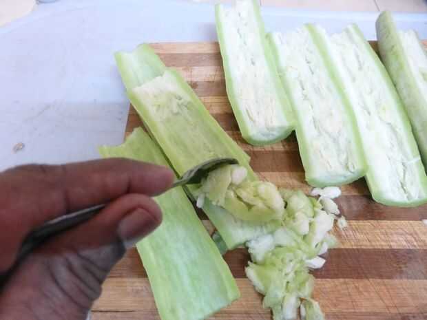 Verduras como la calabaza de la serpiente, calabaza y calabaza de botella con semillas y tejido fibroso que rodea las semillas. No son adecuados para cocinar. Use una cucharadita de chatarra hacia fuera y quitar las semillas y tejido que las rodea