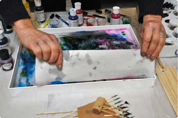 Lavar las herramientas de marmoleado en agua tibia sin jabón. El residuo de jabón en las herramientas puede contaminar futuras impresiones.