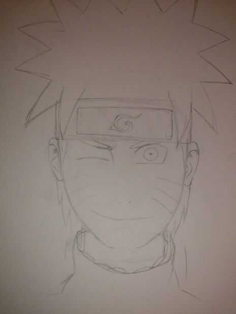 Naruto es famoso también por su diadema, prueba a dibujar una forma de rectángulo entre las cejas y el cabello, y se puede continuar con el dibujo de la insignia que impreso en su diadema. A continuación, puede imaginar un punto en el centro de cada ojos y tratar de enlazar hasta que pase a través de la mandíbula, esto resultará en el dibujo del cuello, después de establecer el cuello puede eliminar las marcas realizadas para medir. Finalmente en este paso, dibujar una forma ovalada unclosed contrario - desde la parte superior - debajo de la mandíbula, mira como una carta de C vuelta cuyas fronteras se abren para arriba (más como una carita ovalada). Esto creará una camisa de nick alta redondeada para Naruto.