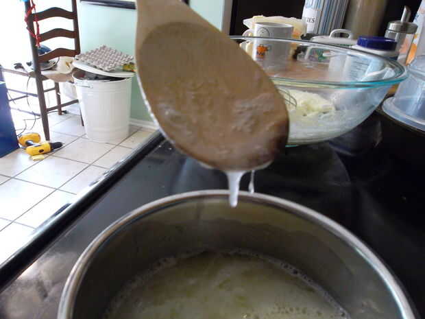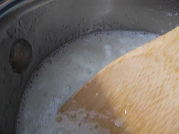 No es necesario remover este constantemente pero recomendamos que usted no deje la mezcla. Yo hice una vez y terminó con una deliciosa crema de caramelo, pero ese resultado no fue diseñado. Lo que está esperando es cuando el azúcar se ha disuelto. puede probar esto periódicamente dejando a parte el goteo de la mezcla de la cuchara y prueba la corriente bajando para granos. Esto no es exacto, que es lo que viene cuando se trata de hacer algo para todos, pero lo hará. Una vez que ha alcanzado esa etapa Retire la olla del fuego. Si tienes trozos de blanco que con el ok como no han hecho dulces blancos revueltos. Necesita la claras y el azúcar a ser líquido.