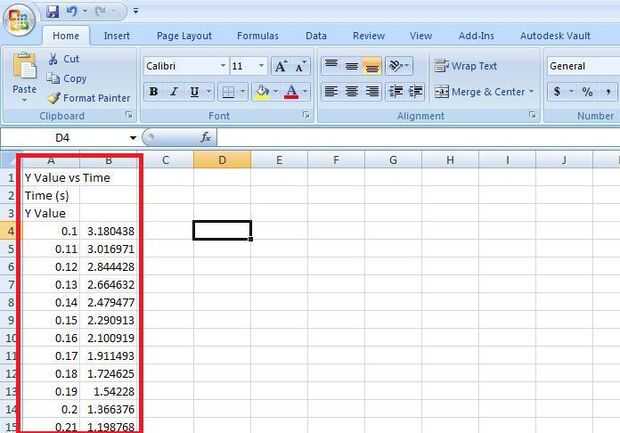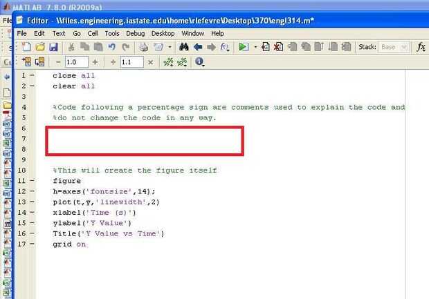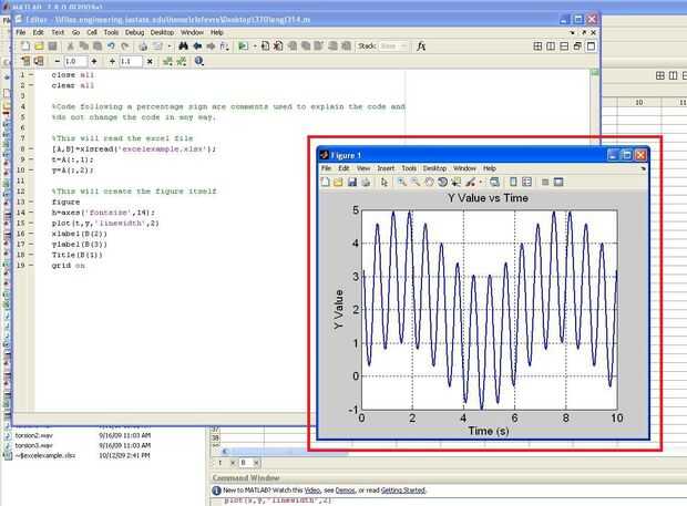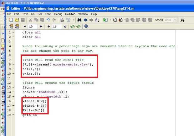 Introduzca el código como se muestra en el cuadro rojo superior de la tercera imagen. Este es el código para leer el archivo de excel. "A" se refiere a una matriz que incluye todos los números en la hoja de cálculo, y "B" incluye todo el texto de la hoja de cálculo. Las variables t e y se tiran de la primera y segunda collumn como se muestra en el código.