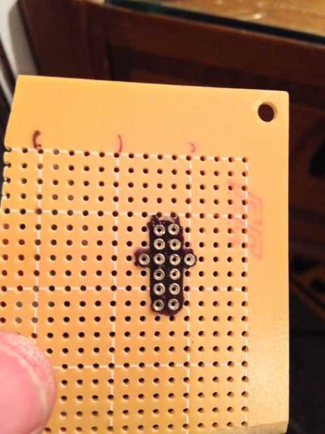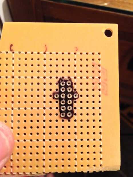 El perf que usé es pad por agujero de Radio Shack. El cuerpo de los pernos fueron aprox. 1,35 mm que es más grande que los agujeros en la board, usé una de 1,5 mm broca con mi dremel para abrir los agujeros ligeramente. Tenga cuidado de no usar demasiado grande de un poco, porque le retire la almohadilla de cobre y no hay forma de soldar los pines en el paso siguiente.