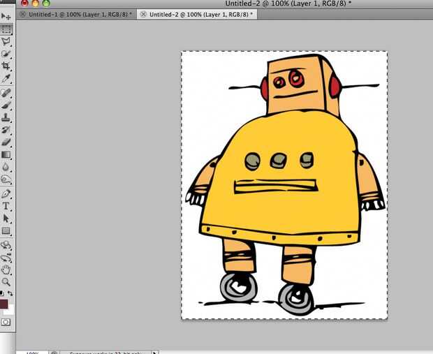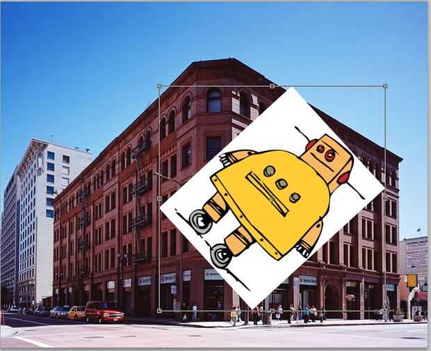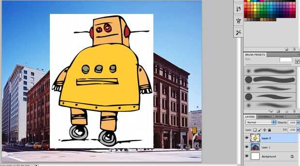 Con el robot seleccionado, copiar la imagen (comando + C para Mac, Ctrl + C en PC) y pegarlo en la imagen con el edificio (comando + V en Mac, Ctrl + V para PC). Al pegar la imagen, debe crear una nueva capa sobre la capa que haya seleccionado. (Segunda imagen)