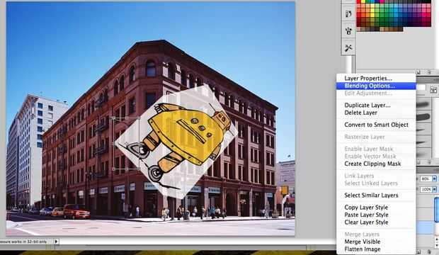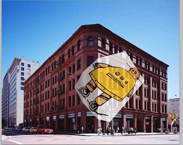 Debe salir con una bandera que parece está en el lado del edificio. Siempre puede ajustar las piezas de la bandera con la herramienta Mover si la herramienta de perspectiva dejó su imagen un poco demasiado estirado, que hice los ajustes como estaba editando otras partes de la bandera. El robot después de sombras es la segunda foto.