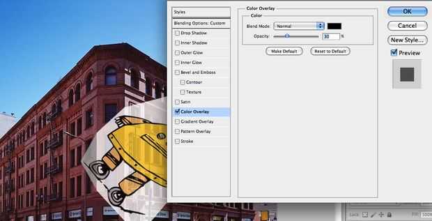 Color Overlay - prefiero utilizar esto cuando quiero oscurecer toda la imagen (como la bandera en el lado izquierdo del edificio).