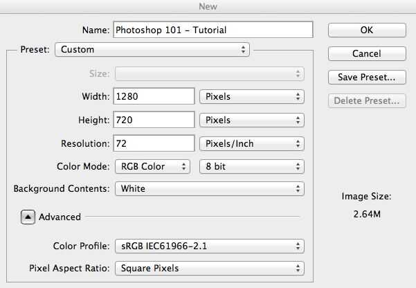 - Modo de color - este es el tipo de color para su documento. Le sugiero que deje como Color RGB por ahora y como 8 bits
