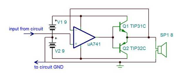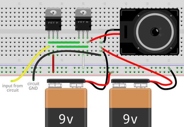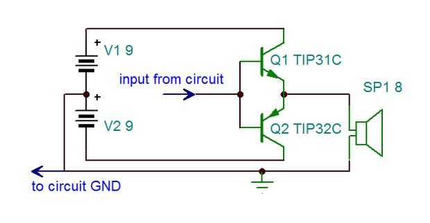 Necesita alta BJT corriente para esto. Me gusta el TIP31C (NPN) y el TIP32C (PNP), pero que es sobre todo porque llego a tenerlos en mi cubo de piezas. Usted también necesitará alguna forma de generación de sonido (como un generador de forma de onda), + y - fuentes de 9V y un altavoz. Echa un vistazo a las hojas de datos para el TIP31C y TIP32C para obtener las asignaciones de pines ya que son diferentes a los paquetes más pequeños de la a-92. Mirarlas con la lengüeta hacia la parte posterior, las clavijas son de base, colector, emisor de izquierda a derecha. Una vez más, revise las hojas de datos.