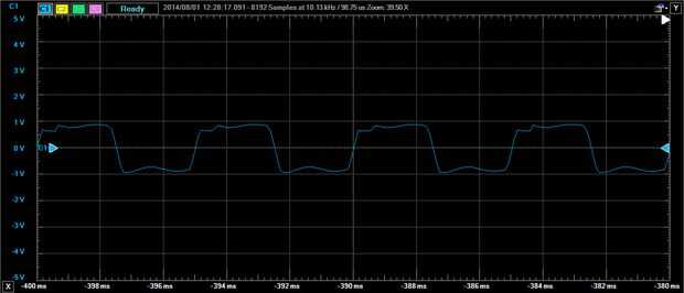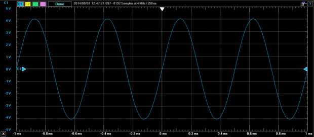 Imagen 7 muestra el mismo circuito, pero esta vez con un amplificador operacional conectado como seguidor de tensión. Esto asegurará que la tensión permanece igual desde la entrada hasta la salida, mientras sigue permitiendo el BJT a hacer su trabajo de proporcionar más actual para el altavoz utilizar. Esto es especialmente útil en frecuencias más altas. Entre imágenes 8 y 9 se puede ver la diferencia que hace que el seguidor de voltaje en la eliminación de distorsión en las frecuencias altas. Aquí la entrada es una onda senoidal de 2kHz con la misma amplitud como antes. El altavoz de 5" fue unido a la salida. Y sí, era muy ruidoso.
