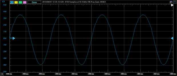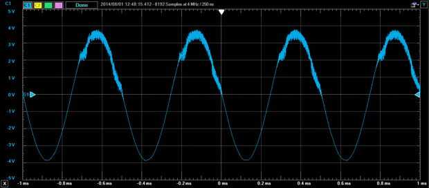 He probado este circuito con un altavoz de 1" y con un altavoz de 5" y obtuvo resultados casi idénticos. La señal de prueba fue una onda de seno de 4Vp 0 a 200 Hz. imágenes 3 y 4 muestran la distorsión de la onda debido a las características de los altavoces cuando no hay ningún amplificador conectado (imagen 3 es el altavoz más pequeño). Cuando se conecta el amplificador de potencia, vemos una salida mucho mejor, como se muestra en las imágenes 5 y 6 (imagen 5 es el altavoz más pequeño). Pero todavía hay algo de distorsión y la entrada de 4V se ha caído un poco por la tensión de umbral de lo BJT. ¿Cómo arreglar eso?