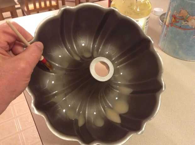 Cubrir cada milímetro cuadrado de la cacerola con la mezcla de harina y aceite usando una pasta o cepillo de hilván. Asegúrese de que está cubierto todo el interior de la cacerola de bundt. Después de que la bandeja está cubierta, drenar el exceso girando la bandeja boca abajo en el desagüe de la cocina, no hay mucho petróleo que drena, así no dolerá demasiado gravemente el medio ambiente. Puede que desee utilizar sólo 3/4 de la mezcla, entonces no debe haber ningún exceso.