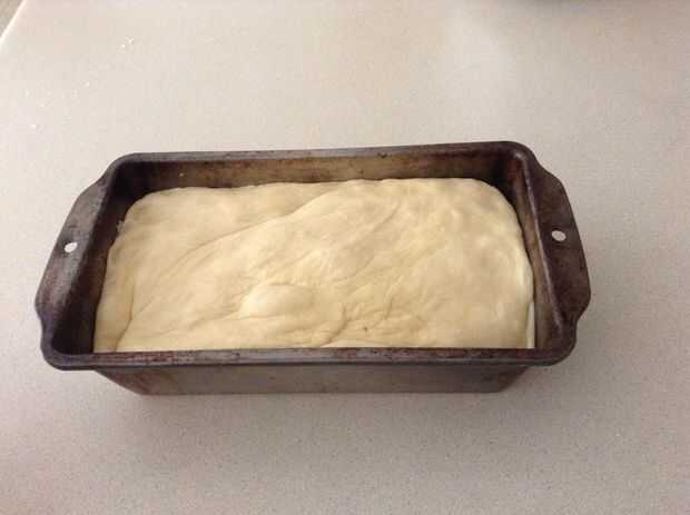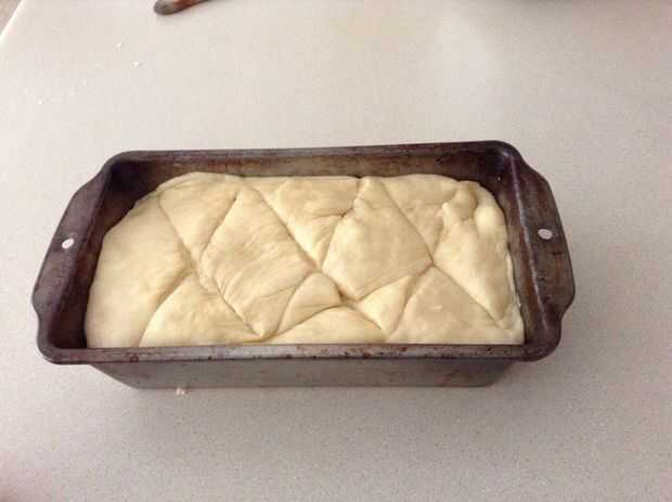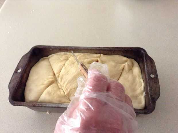Si usaste las medidas exactas de harina, debe ser capaz de volcar el derecho de la masa en la bandeja para hornear. Usar guantes de plástico para alimentos en caso de que tengo que ayudar a lo largo de un poco más. También, una nota aquí, suele hacer un gran pan y un pan pequeño, porque la cantidad de masa es un poco demasiado para un molde normal. La barra de pan pequeña es de aproximadamente 1 1/2 tazas. Sólo lo pongo en una bandeja o en otro recipiente para pan. Observa en los cuadros que anoto el pan con un cuchillo. Si eso no se hace, el pan tendrá algunas grietas profundas donde no quiere. Esta manera, pones las grietas en un patrón ordenado en la parte superior del pan.