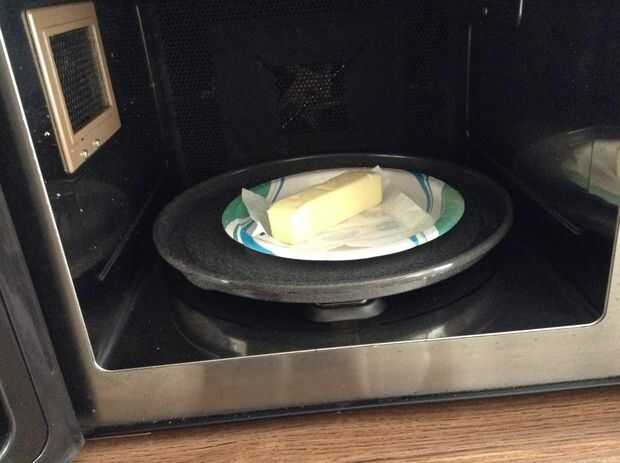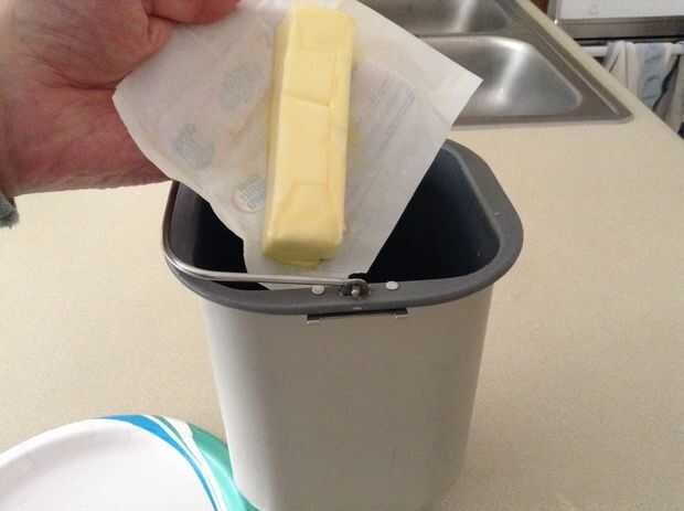 La mantequilla debe estar a temperatura ambiente cuando se añade a la panificadora. Nunca recuerdo a calentar la mantequilla a temperatura ambiente antes de hacer pan, así que tome directamente de la nevera y ponerlo en el microondas durante 2 minutos en el desescarche. la mantequilla es casi, pero no del todo--derretida entonces. Es justo. Si utiliza aceite vegetal en lugar de mantequilla, obviamente no necesita descongelar algo, sólo tiene que añadir media taza de aceite.