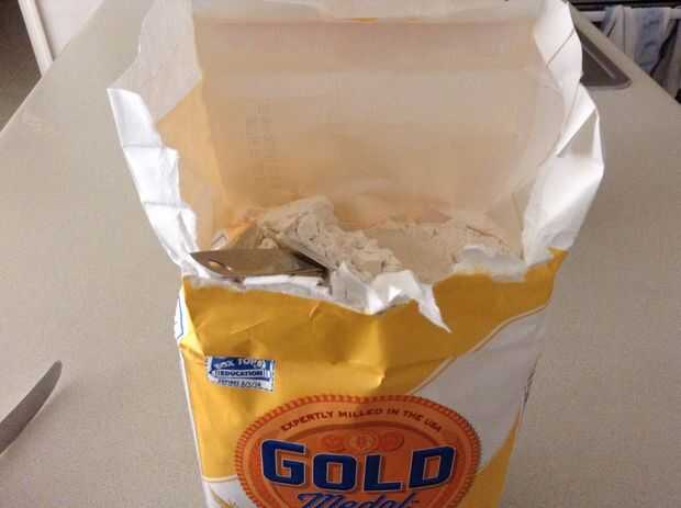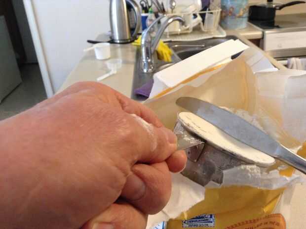 Esto debe ser medida precisamente. Añadir exactamente 3 1/4 taza de harina. Use un cuchillo para nivelar la parte superior. No adivinando aquí. Debe ser exacta, de lo contrario, que o bien tienes un pan muy duro o una masa muy húmeda que es imposible la descarga en la bandeja para hornear.