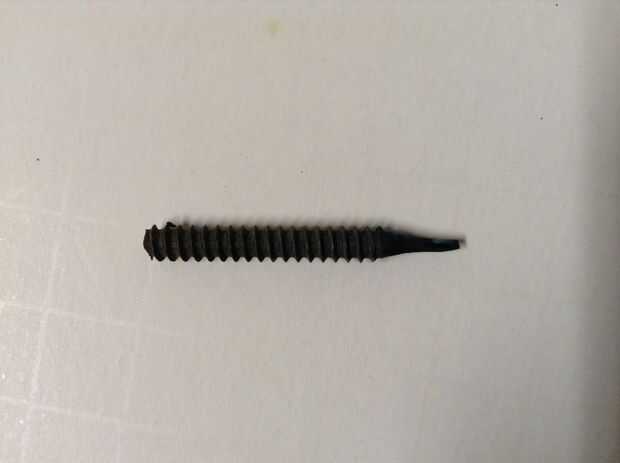 No quería usar mi punta regular para derretir el plástico. Por un lado, sería una ranura que era demasiado grande para mi propósito. Para hacer la punta tomé un pequeño perno de 3/16 y a cortar sobre una longitud de 1 1/2". Usé un molino para moler la punta a poco menos de 1/16". La parte baja de la punta es de aproximadamente 1/4" de largo. Si no tienes un molinillo, puede que desee utilizar un archivo; sólo tardará más en hacer. +
