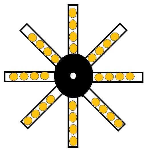 2a2: revólver de tolva: este diseño utiliza 8 tolvas de línea recta (que son gratis jam) sobre un revólver para ahorrar espacio vertical. -por Oblivitus