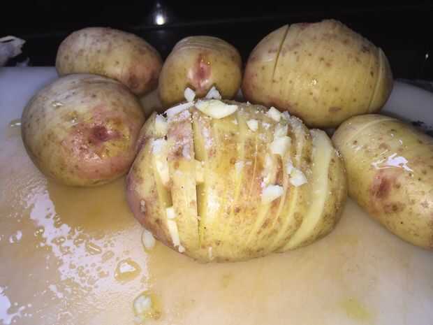 Así, se coge una patata y empezando en un extremo o el otro hacer varios cortes verticales a través de las tres cuartas partes de la patata. No te preocupes los confines que se puede dejar solo. Una vez cortadas, luego tomar las rebanadas de ajo y entretejen entre las rebanadas de patata, sazona con sal y pimienta y un poco aceite de oliva.
