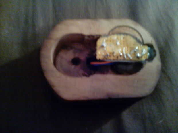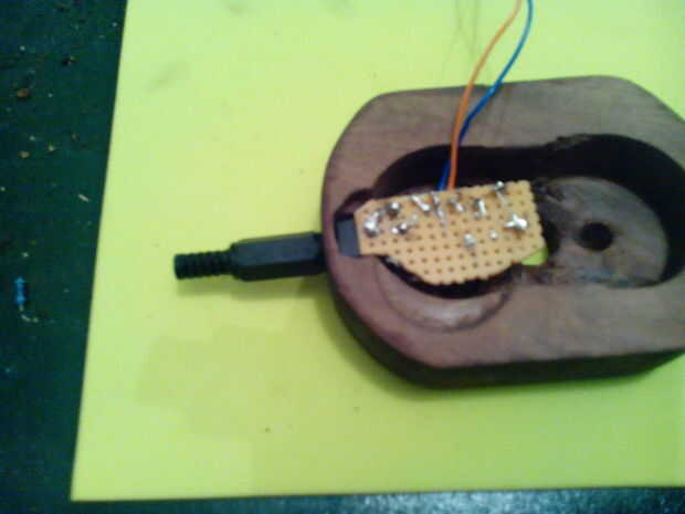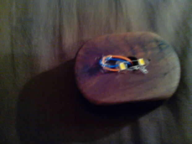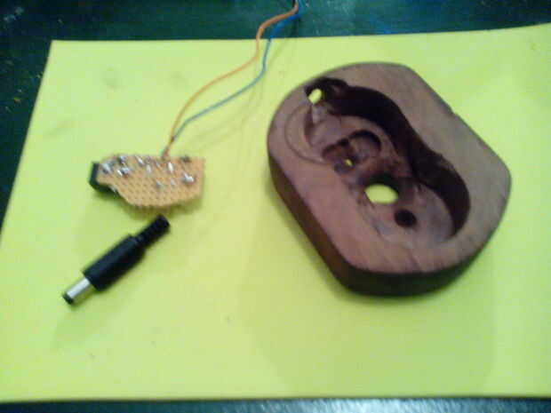Este es un paso muy importante, tenemos que colocar el controlador de modo que nos podemos conectar la fuente de alimentación a través de un agujero en la madera. Como tú puedes ver, corte una muesca en el lado de la madera, esto es donde va el lado femenino del gato. Esta muesca debe ser lo suficientemente profunda como para que la madera que separa el lado masculino y femenino es delgada. Esto es para que realmente hace que la clavija de contacto en el conector hembra. Una vez que lo tenemos en la posición correcta, nos podemos caliente pegamento en, no dude en usar un montón de pegamento, ya que es lo único que sostiene el circuito pulg entonces tomar los LEDs y ponemos a través del agujero que hicimos y pegar en la parte superior de la Junta. Casi hemos terminado!