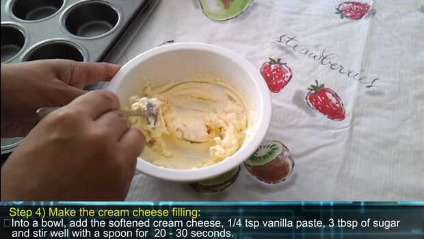 • En un bol, agregar el queso crema ablandado, pasta de vainilla 1/4 de cucharadita, 3 cucharadas de azúcar y revuelva bien con una cuchara durante 20 – 30 segundos.