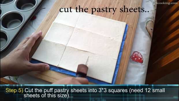 Paso 5) Cortar las hojas de masa de hojaldre en cuadrados de 3 * 3 (necesitas 12 hojas pequeñas de este tamaño)
