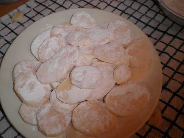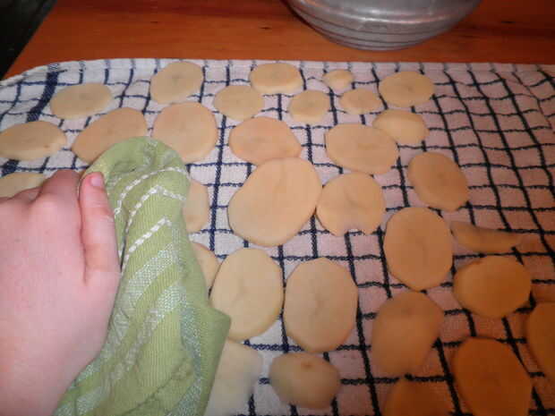 Uno a la vez, tomar las papas y cubierta extra de harina, sacudiendo el exceso. Si estás corto de tiempo, ponga la harina en un bolso plástico del congelador, añadir patatas y agite hasta que cubierta de forma uniforme.