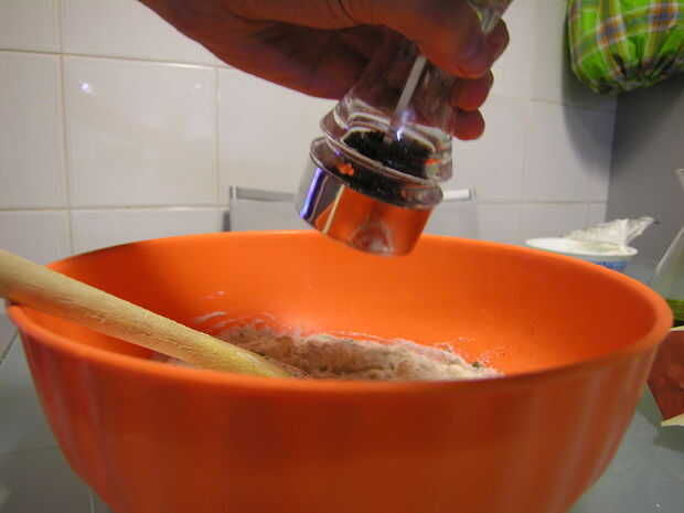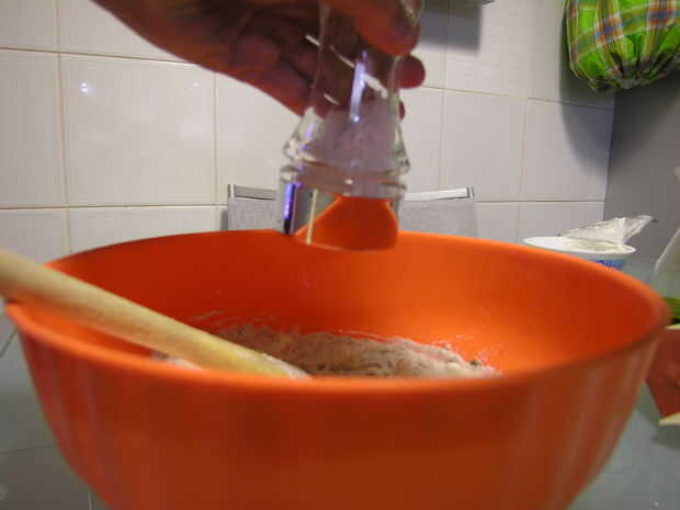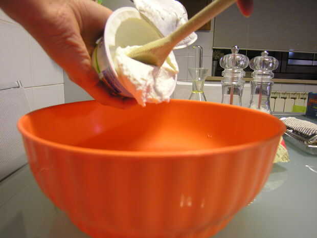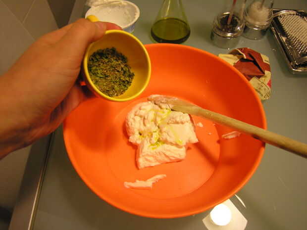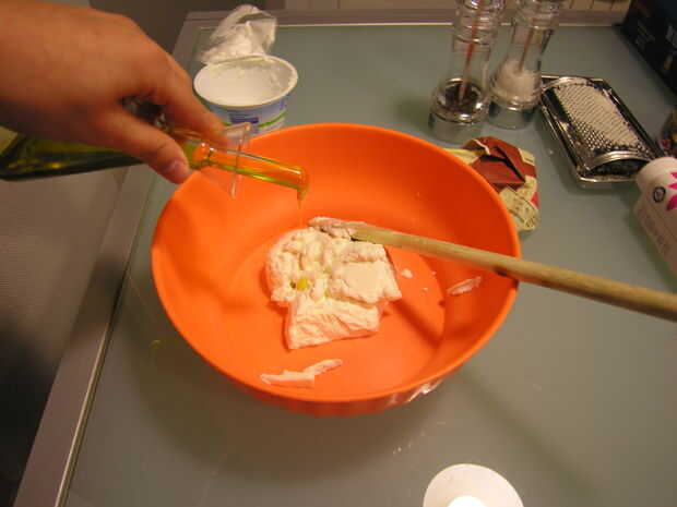 ok, ahora toma un bol grande y poner el requesón en su interior. Añadir unas gotas de aceite, las hierbas, sal y pimienta. Si usted quiere, usted puede diluir con alguna crema.