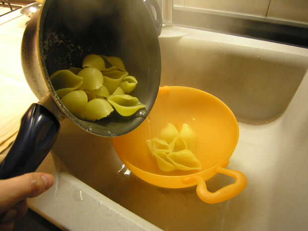 Colar la pasta después de 10 minutos y dejar que el conchiglioni enfriar sobre un paño blanco. Separar cada pieza de pasta o no serás capaz de poner el relleno dentro.