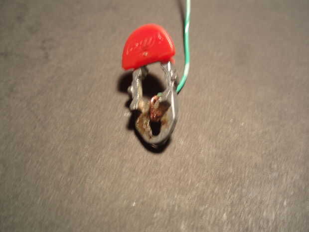 Encontré que el metal aquí no le gusta la soldadura mucho, ahora esto pudo haber sido mi propia ineptitud porque como ya he mencionado antes de soldar no es mi fuerte, (pero eso es!... ejem... lo siento... mal chiste). Encontré pelar el cable para arriba aproximadamente una pulgada y envolver el alambre varias veces y soldadura hicieron el truco.