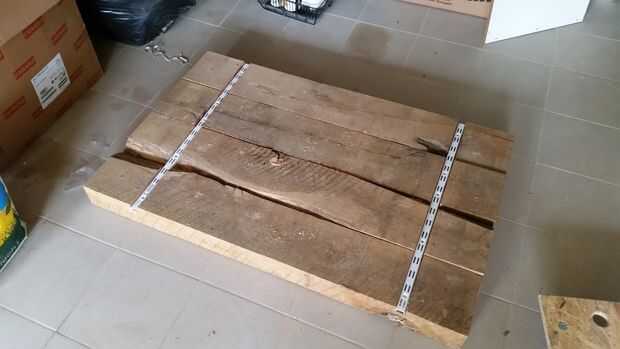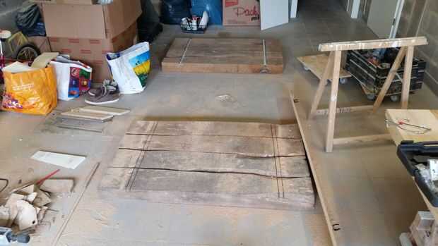 Así que hemos cortado el oakplanks en 8 pedazos de 150cm largo un cortado 2 ranuras con la circular de la mano vieron que encajen en la barras un tornillo de hierro.