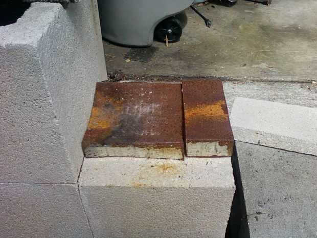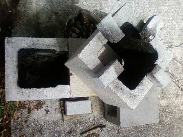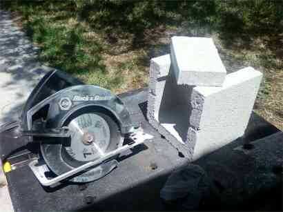 Esto toma tres 8 "x 8" x 8" bloques y una 8" x 16" x 1" losa de base. Una cuadra tiene el lado aserrado hacia fuera así que puede hacer la curva.