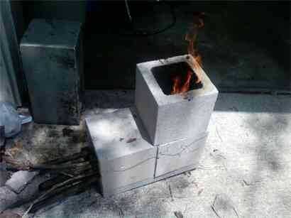 Esto es un verdadero cohete de la estufa, aunque no está aislado. Para comenzar, puede que necesite acelerador por poner algo encima para ahogar un poco el aire de escape. Podría caer alguna suciedad seca o arena hacia abajo de la chimenea para aislar la base, pero no es necesario.