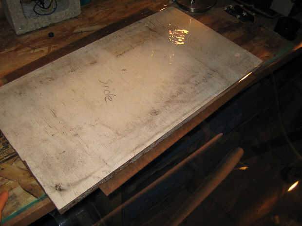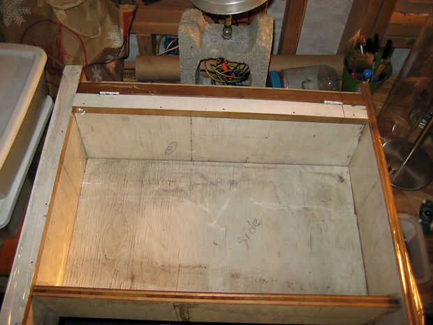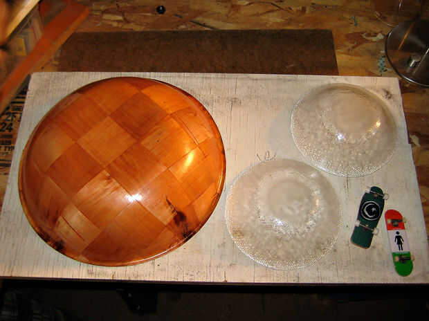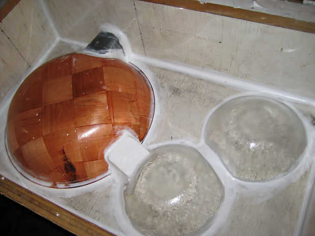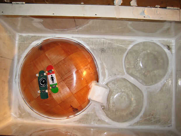 Construimos una tina de madera contrachapada de 3/4 de chatarra y aerosol había pegado algunos Plasticos a él. Para crear las formas del tazón de fuente, utilizamos 1 recipiente de madera más grande y 2 pequeños cuencos de vidrio. Las brechas de las transiciones en forma de unos trozos de espuma de poliestireno y cinta adhesiva.
