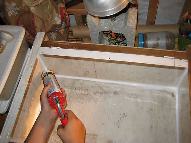 Utilizamos masilla para hacer transiciones suaves y esquinas redondeadas. Utilice el dedo y un poco de agua para suavizar generoso granos/globos de calafateo. Deje que la masilla seque durante la noche antes de verter hormigón.