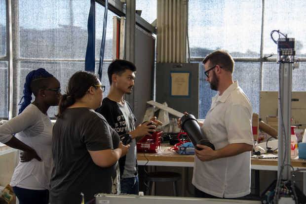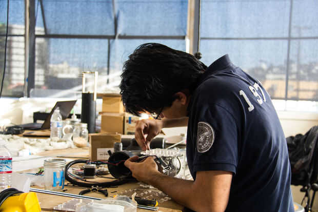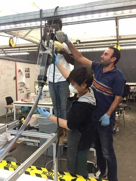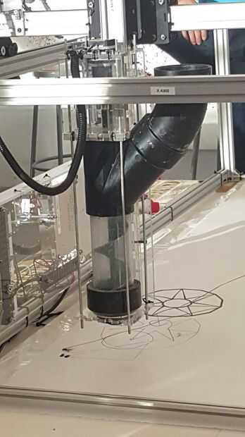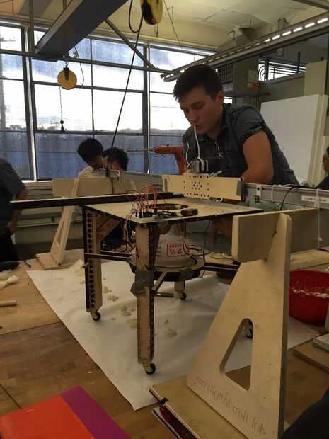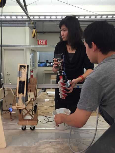 El proceso para las máquinas seguidas una inicial similar proceso de diseño. Al principio del estudio de cada uno rápidamente el prototipo varios máquina tipos de actuadores mecánicos de cremallera y piñón, máquinas taladro basado en máquinas que son accionados neumáticamente. Las dos máquinas que vimos más potencial después de esta primera ronda de pruebas fue un taladro basan sistema, así como un pistón neumático. Allí eran dos equipos de dos estudiantes cada una de las dos opciones. Efector final mecánico, Arash Sedaghatkamal y Gloria Asaba el efector final de penumatic liderado por Joseph Chang y Sam Sellery. Como comenzó a crear y diseñar un efector final que podría montarse en el pórtico. ¿Cuánto peso con y sin material que puede manejar? ¿Qué tan grande físicamente ¿será? ¿Cuál es el diámetro de la boquilla? ¿Cuan rápida es la tasa de flujo de materiales? ¿Puede apoyar a deposición de material continuo? Si no es así, ¿cómo funciona el sistema de tolva? Estos fueron los tipos de preguntas que se piden para que podríamos empezar a diseñar y crear máquinas que se cumplen estos criterios.