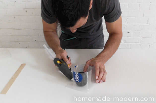 Usa la pistola de pegamento caliente para pegar el tubo de plástico cortado de la botella de agua a la placa base inferior. Aplicó pegamento toda la manera alrededor para asegurarse de que fue sellado y apretado del agua.