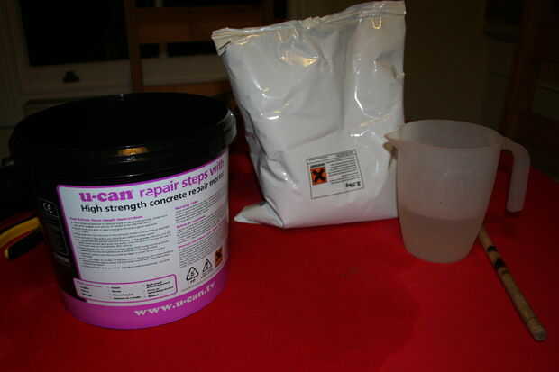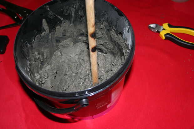 El cubo contiene dos bolsas separadas 2,5 kg. Sólo necesitaba uno de ellos. Las instrucciones sugirieron agregar 400ml de agua, pero he añadido más como 800ml - 1L para mejorar la trabajabilidad de la mezcla. No es recomendable para hormigón estructural, como la relación agua-cemento tiene grandes consecuencias para la resistencia del hormigón, pero dado que no es portadora, es aceptable. Añadí agua hasta que la mezcla era bastante descuidada, suficiente tal que sí funcionaría en las diferentes partes del molde sin ninguna persuasión adicional. Usé una vieja cuchara de madera para la mezcla en el cubo.