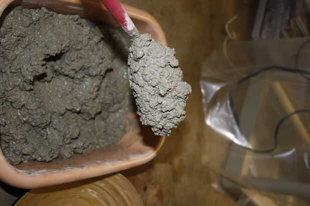 Poner hormigón en moldes... Usé mi cuchara a cuchara de mezcla de hormigón en los moldes.  Cuando se llenan los moldes, toque en el concreto para eliminar las burbujas.