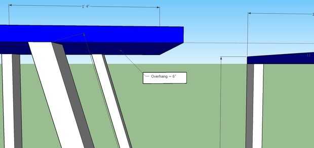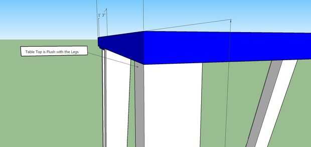 En el frente de cada mesa, las piernas angulosas se unen para que las tapas de tabla son sobresalir unos 6 pulgadas desde el exterior de la pierna.
