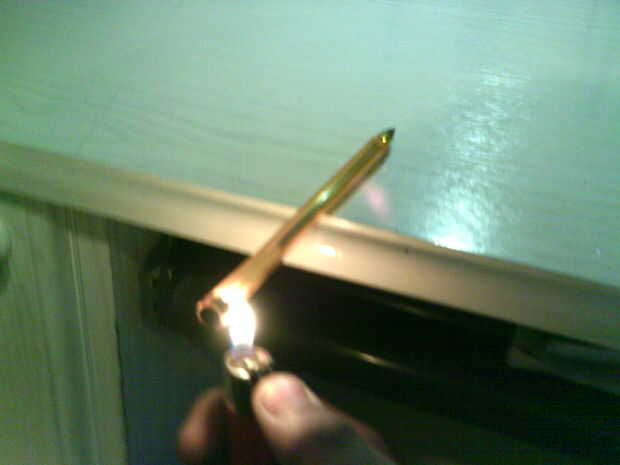 Basta fundir un área. Para hacer esto, simplemente vuelta la pluma encima de la llama y esperar a que las holguras de la pluma. Además, mantenga la pluma en sus dedos, no lo coloque sobre la mesa como hice yo para la foto.