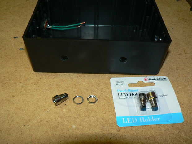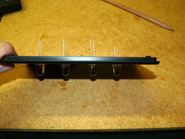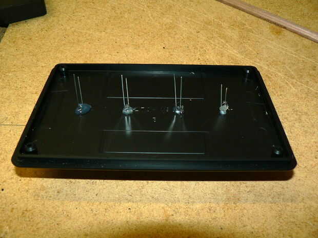 Comencé por taladrar 4 orificios en la parte superior de la caja para los LEDs (Foto 1). Empuje el LED cables a través y caliente pegamento en la parte inferior de la tapa. Esto los mantiene en su lugar y ayuda a mantener los cables separados. Usted notará que los LED tienen un lado plano. Esto identifica el cable negativo, así que trata de orientar todos sus LEDs de la misma manera (fotos 2 y 3).