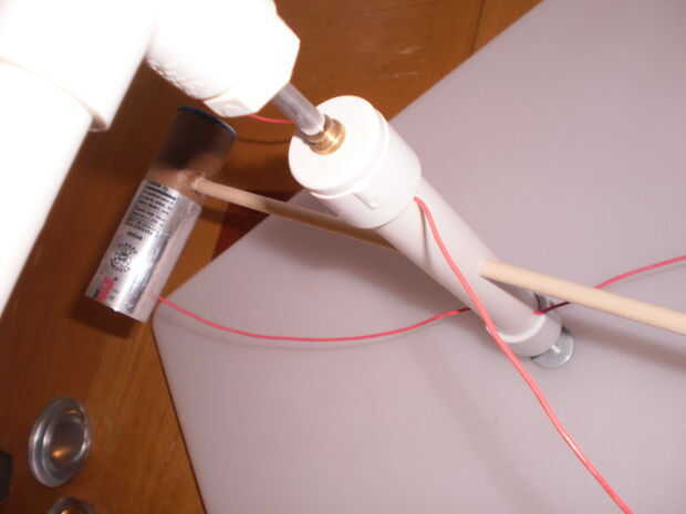 Justo debajo de la parte superior e inferior tapas taladro pequeño (1/16 pulgada) agujeros en ambos lados del eje alinean con la clavija. Cortadas dos tramos de 22 cable de campana calibre 16 a 17 pulgadas de largo. Tira todos los extremos de cuatro 3/4 de pulgada. En el centro de los cables, cuidadosamente la tira de 1 pulgada de aislamiento, dejando el alambre en el medio. Haga un bucle en esta sección pelada. Colocar el lazo sobre la cabeza de uno del tornillo en el casquillo de la pipa. Estire y apriete la tuerca moleteada en el exterior, atrapando el alambre contra la tapa. Repita este proceso en la segunda tapa. Alimente el alambre en el eje y hacia fuera otra vez a través de los agujeros de 1/16, superior e inferior. Apriete las tapas en su lugar.