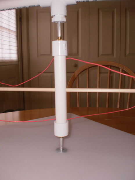Cuando está seco el montaje del huso, inserte el perno inferior alisado en el espaciador de aluminio montado en el tablero de corte. Montar el conjunto superior a los dos tubos verticales, teniendo cuidado de encajar al espaciador superior sobre el perno de latón alisado sobresale de la parte superior del huso. Presione la parte superior Monte lugar de int. Compruebe que el eje gire libremente. Si no, aplique grafito (no aceite!) a los espaciadores y ajuste cuánto el conjunto superior presiona hacia abajo en el eje.