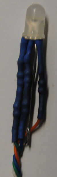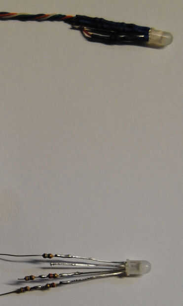 Después de calcular la resistencia adecuada usando la ley de Ohms para los LEDs entonces usé mi medidor Fluke laboratorio para obtener la corriente lo más cerca posible a las especificaciones de fabricantes. Por eso hay dos resistencias en serie en dos de los conductores. Podría han utilizado los dos LEDs en paralelo pero quería poder controlarlas por separado.