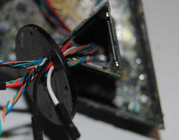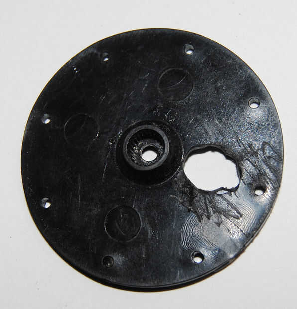 Ahora toma una rueda redonda servo corté un agujero grande para que el paquete de cable de la cabeza pasar libremente. También me aseguré que el agujero no era a grande por lo que se pudo ver cuando el cuello estaba en lugar. Luego utiliza una broca larga y perforó un agujero en la parte superior de la cabeza. Este agujero es por lo que puedo apretar el tornillo del brazo del servo y colocar la cabeza.