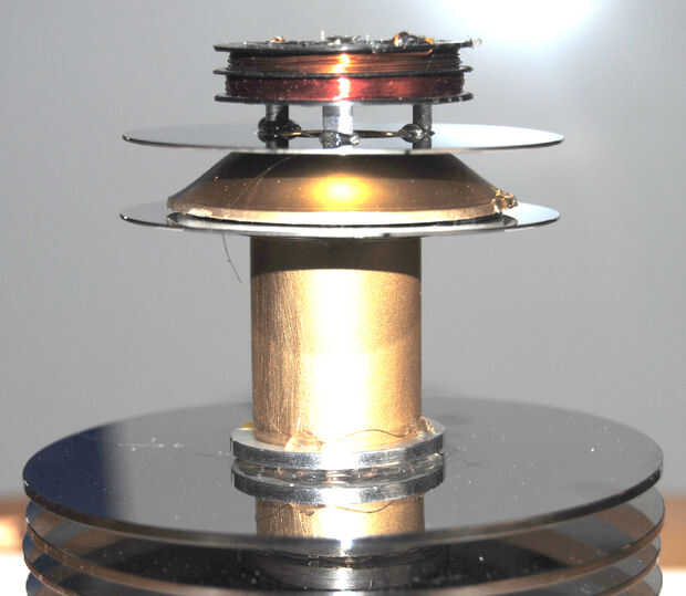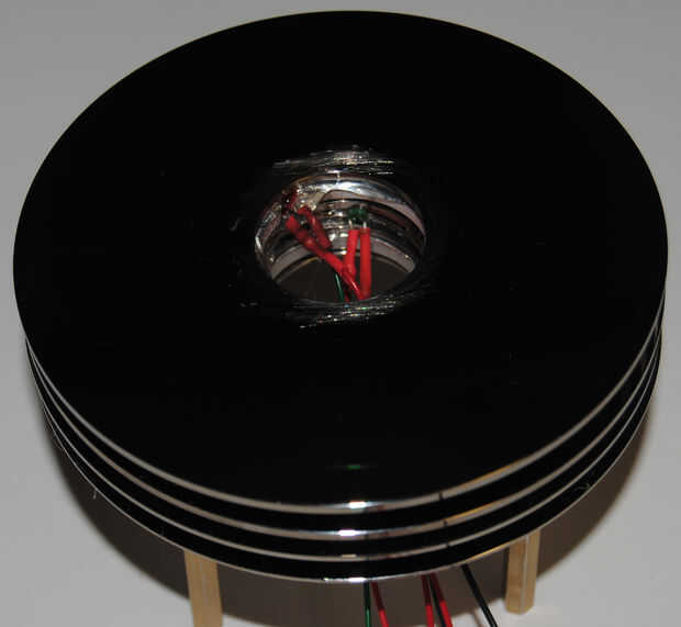 Ahora es de conjunto de cada plato se pegan juntos viendo donde estará apuntando el LED. Me ha añadido otro pequeño trozo de tubo luego agregó dos bandejas superiores de vuelta. El separador fue divertido porque haciendo este proyecto corrí de soldadura mecha y decidido, lo has adivinado lo de arena y pintura oro.