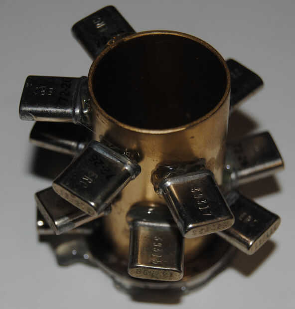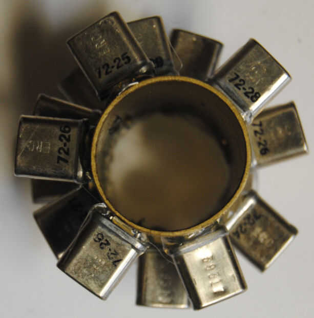 Querer ocultar todos los cables, diez en total. Encontré un trozo de tubería del mismo diámetro del agujero del plato de plástico, cortar del mismo tamaño que los distanciadores y había pintado de oro. Entonces pegué algunos viejos cristales en forma de espiral alrededor del tubo. No encolarla al condensador de flujo hasta el siguiente paso.