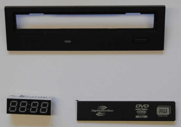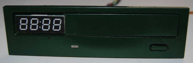 Durante los tiempos de secado de la pintura decidí trabajar en la placa delantera. Cortar la parte delantera de la bandeja para que la exhibición de cuatro cifras cabría entonces caliente pegué prueba frente a la placa frontal. Luego lijado y había pintado de la placa de cara verde. Después de que la pintura estaba seca me caliente había pegado la pantalla en el lugar luego agregó los alambres de la pantalla.