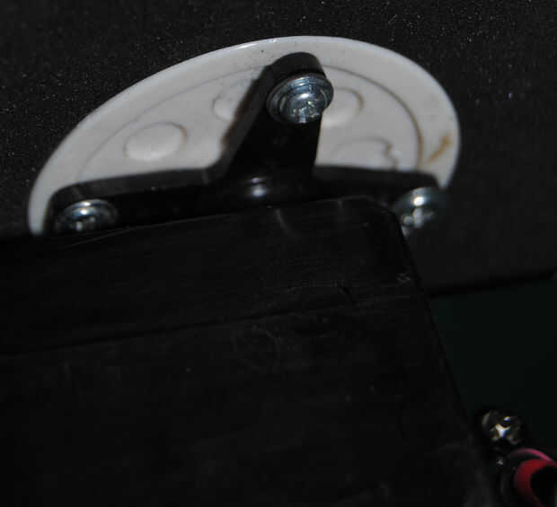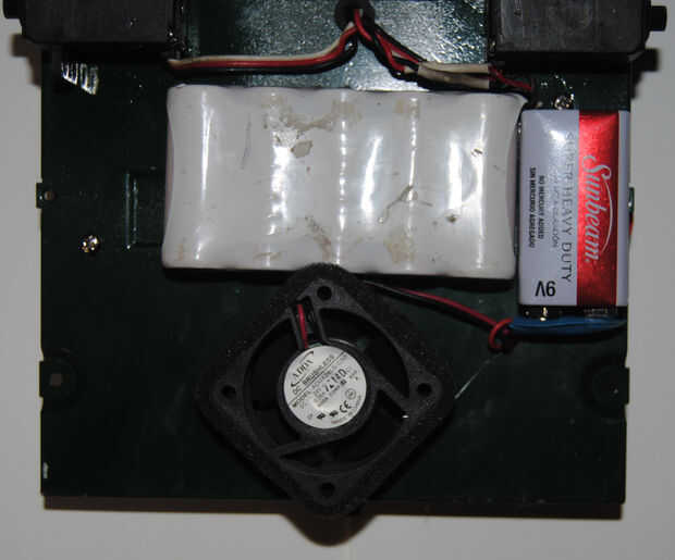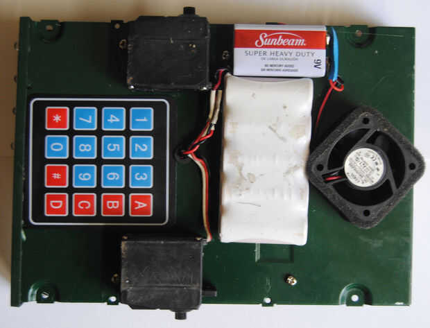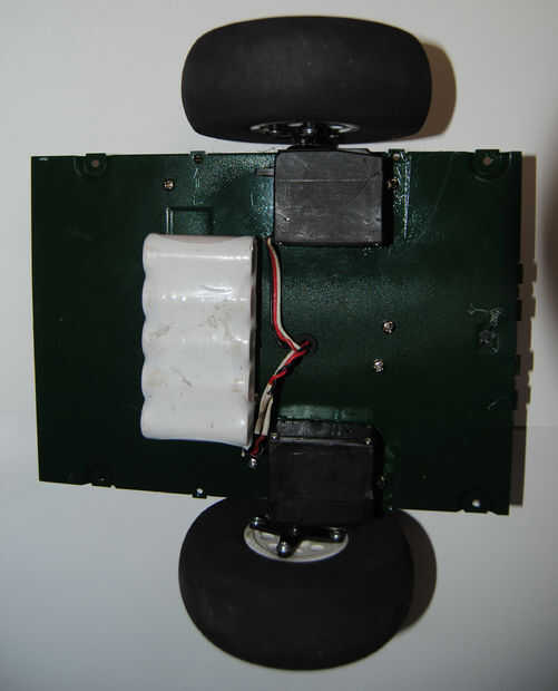 Entonces pegué un seis voltios, 2000 Mah. batería (RC otra reliquia) en la parte inferior. Esta batería se usa para conducir los motores servo.