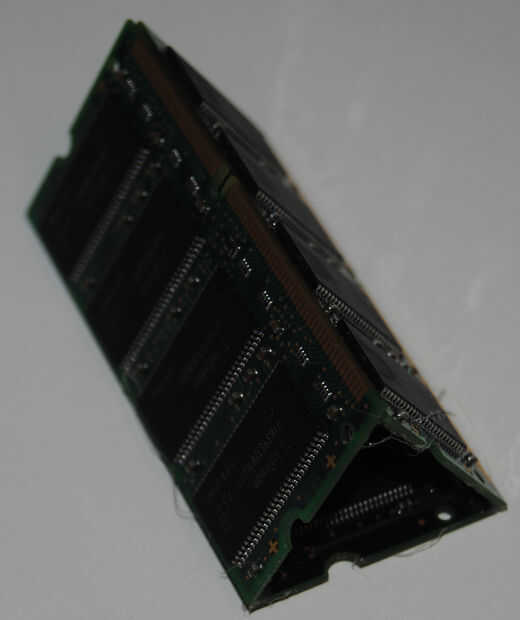 Así que para el cuello, mientras miraba a través de una caja de basura la computadora encontre algunos antiguos chips de memoria de escritorio y portátiles. Pegué tres chips de ordenador portátil en una longitud de triángulo forma.