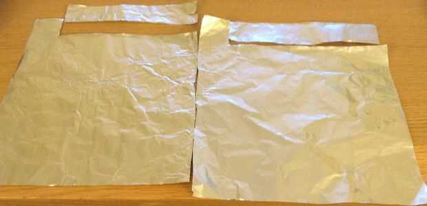 2. corte las secciones rectangulares (1.5x5 pulgadas, 3.8x12.7 cm.) de las hojas de aluminio por lo que es una ficha (1.5x1.5 pulgadas, 3.8x3.8 cm) sobresale la parte superior esquina izquierda de cada pieza. Ver arriba figura por ejemplo.