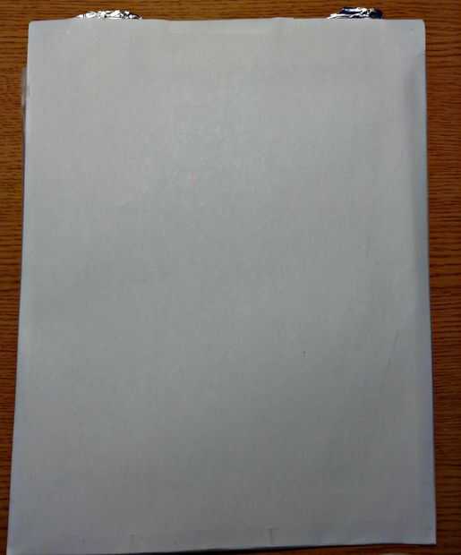 1. con cinta adhesiva un pedazo de papel (2 total) sobre las hojas de aluminio a cada lado para cubrir todas de aluminio expuestas salvo las lengüetas que sobresalen en la parte superior.